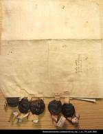 3 anhängende Siegel beschädigt erhalten; 2 anhängende Siegel beschädigt erhalten