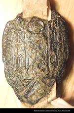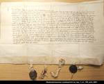 Anhängende Siegel 1 beschädigt erhalten, 2 und 3 verloren, 4 beschädigt erhalten