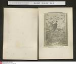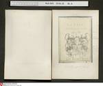 Fotographie 46: Zeichnung: Mann reitet mit Falken und zwei Hunden durch eine Landschaft; links und rechts oben auf jeweils einem Hügel zwei Bettler; links unten knieender Mann; rechts unten ein Stachelschwein.