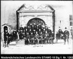 Enthält: Gruppenaufnahme von Soldaten vor dem Hauptportal des Zeughauses, an der linken und rechten Seite: je ein Geschütz, links neben dem Portal: ein Wachhäuschen, links vor der Gruppe ein Schild mit Aufschrift und Wappen (mit Datum : 1899 ?): "Hoch lebe die Reserve. 5 (Br. ?) Batt. - F.A.R. ... Parole Heimath. Wir können nimmermehr verderben, Denn uns umschlingt ein Bruderband. Wir alle ... Mit Gott für Kaiser und Vaterland !"