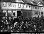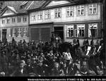 Enthält: Marschierende Soldaten, davor: ein Offizier zu Pferd und Soldaten mit Blasinstrumenten in der heutigen Dr.-Heinrich-Jasper-Str. [?], Zuschauer