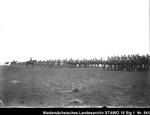 Enthält: In Front aufgestellte berittene Soldaten, links: auf mit Pferden bespannten Geschützlafetten, rechts: Blaskapelle