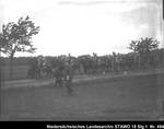 Enthält: Soldaten zu Pferd mit Blasinstrumenten auf dem Marsch auf einem Feldweg